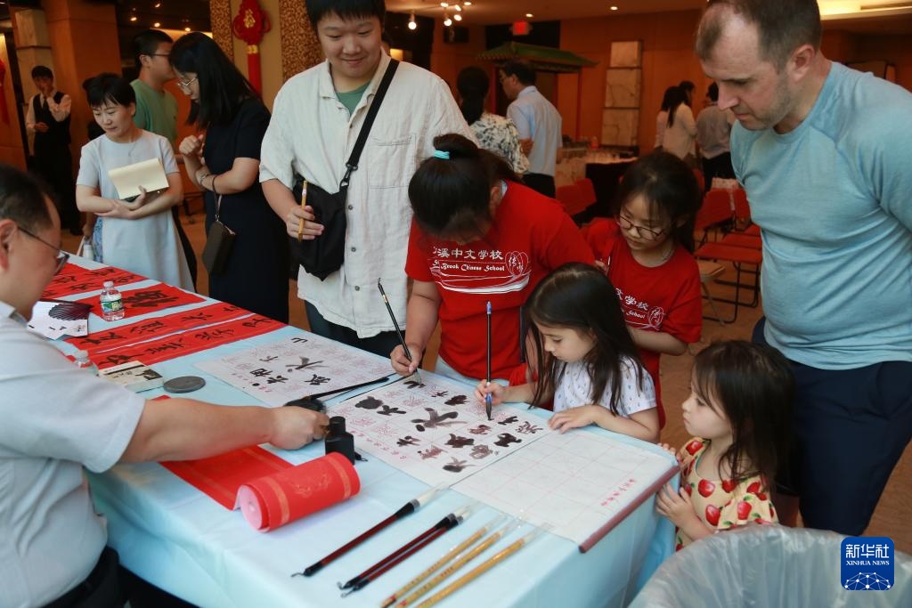 7月13日,在美國紐約,學生體驗書法。新華社記者 劉亞南 攝