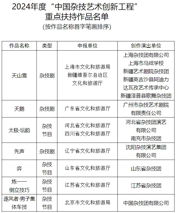 中新網7月16日電 據文旅部網站消息,根據《文化和旅游部辦公廳關于開展2024年度“中國雜技藝術創新工程”重點扶持作品申報工作的通知》(辦藝發〔2024〕15號),文化和旅游部藝術司組織專家對申報作品進行了認真遴選,共選出7部(個)重點扶持作品?,F將重點扶持作品名單予以公布。