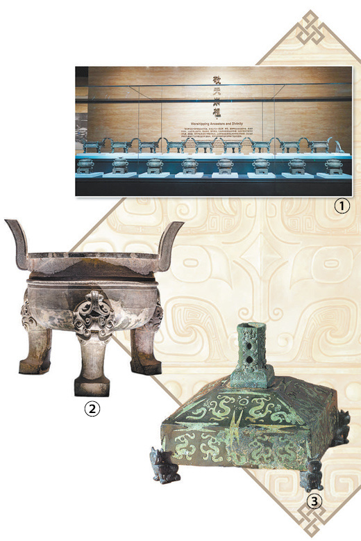 圖①:隨州曾侯乙墓出土的九鼎八簋。 圖②:安徽博物院藏鑄客大鼎。 圖③:紹興坡塘獅子山306號墓出土的方座形器。 以上圖片均為張昌平提供 |