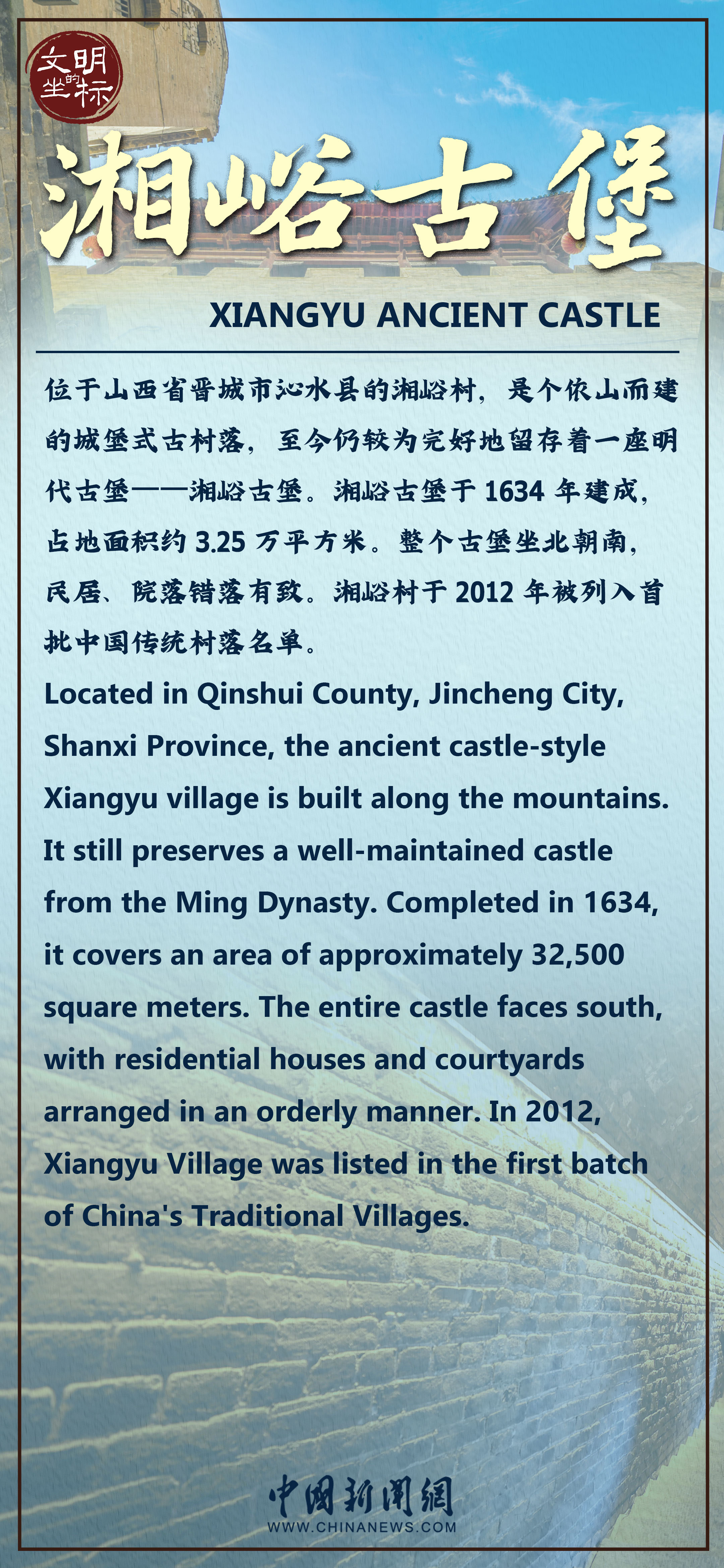 人間煙火,高而不孤。位于山西省晉城市沁水縣的湘峪村是個依山而建的城堡式古村落,至今仍較為完好地留存著一座明代古堡——湘峪古堡。古堡沿河而建,千余米長的城墻將村落包裹得嚴嚴實實,城墻與城內房屋上的拱形窗孔密密麻麻猶如蜂窩,因此又被當地人稱為“蜂窩城”。歷經400多年風雨洗禮,如今湘峪古堡數十處院落依然靜靜矗立,與環繞幾百年的護城河相映生輝,彰顯著古堡無窮的魅力。游覽古堡,欣賞今時風景,追尋古人足跡。