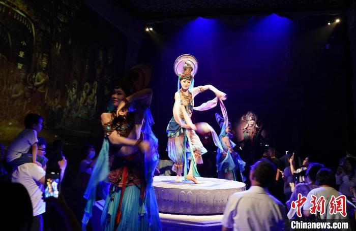 《樂動敦煌》是全球首部洞窟式沉浸體驗劇,利用真人與數(shù)字影像虛實交換實現(xiàn)沉浸式體驗。圖為2023年8月28日晚,《樂動敦煌》演出。(資料圖)中新社記者 毛建軍 攝