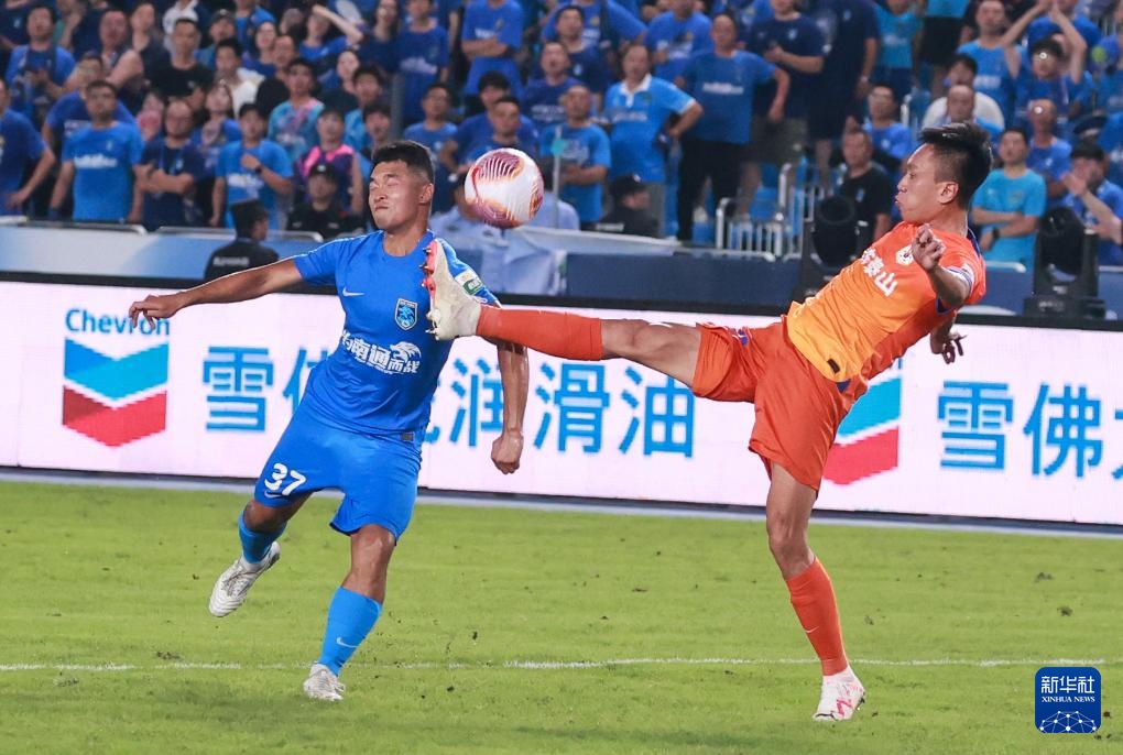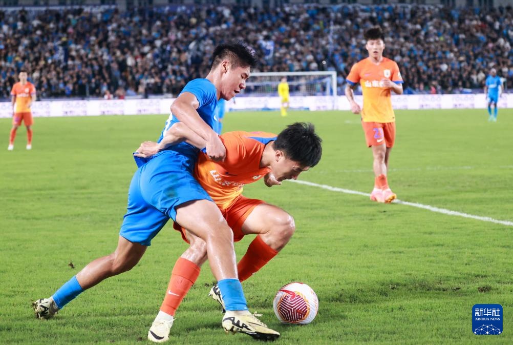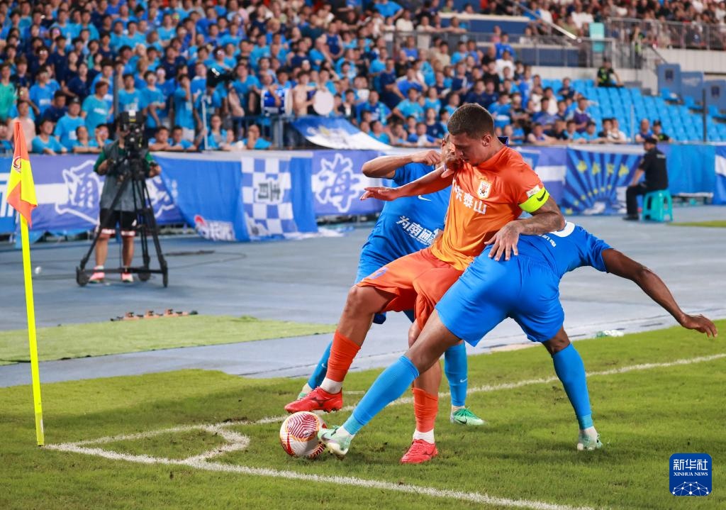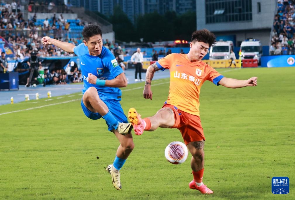7月21日,山東泰山隊球員謝文能(右)與南通支云隊球員葉道馳在比賽中拼搶。新華社發(邱宇攝)