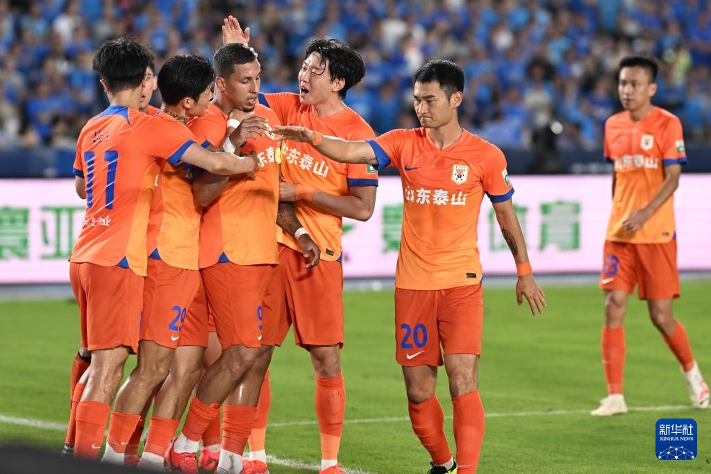 7月21日,山東泰山隊球員克雷桑(右四)與隊友在比賽中慶祝進球。新華社發(王須中攝)