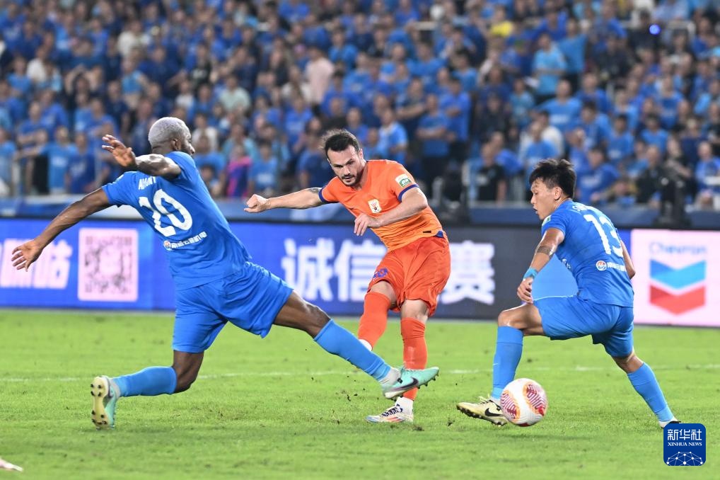 7月21日,山東泰山隊球員克雷桑(中)在比賽中拼搶。新華社發(邱宇攝)
