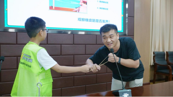活動現(xiàn)場,來自省計量院聲學、振動計量技術(shù)研究所專業(yè)技術(shù)人員胡小明現(xiàn)場向孩子們展示了橡皮筋發(fā)聲實驗,變換拉伸、按壓、揉搓、彈撥橡皮筋,以此觀察橡皮筋的發(fā)聲情況,引導孩子們思考聲音是如何發(fā)出的,并為大家講解聲音的大小及人耳可識別的頻率范圍,還對應(yīng)播放了50Hz、500Hz、2000Hz、8000Hz不同頻率范圍的聲音音頻,沉浸式帶領(lǐng)他們感受不同頻段的聲音差異。胡小明還向孩子們講解了如何通過專業(yè)儀器進行聲音的測量,讓其對計量如何在聲學中發(fā)揮作用有了更直觀的認識。通過體驗,他們能夠更加直觀地感受到科技與生活的密切聯(lián)系,進而激發(fā)對科學技術(shù)的探究和追求。