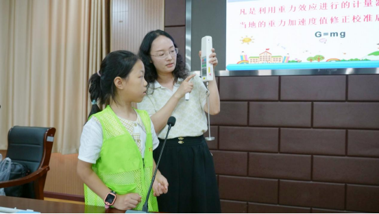 “飛流直下三千尺,疑是銀河落九天。”省計量院劉瓊馨博士以李白的一首《望廬山瀑布》作為引子,巧妙地提出問題:“水為什么往低處流?”并延展至生活中觀察到的現(xiàn)象,“向天空拋出的石子為何落回地面?”而后,她自然地將話題引向了影響水流和石子落地的重要因素——重力,進而深入淺出地講解了重力加速度小數(shù)點后的秘密,帶領(lǐng)孩子們了解和認識重力加速度在礦產(chǎn)資源勘測、海洋科學等方面的應(yīng)用,以及重力加速度的測量儀器重力儀。這一過程不僅加深了孩子們對重力和重力加速度的理解,進一步感受計量科學的魅力,也讓他們認識到科技進步的背后是無數(shù)次反復試驗和精細調(diào)整的結(jié)果。
