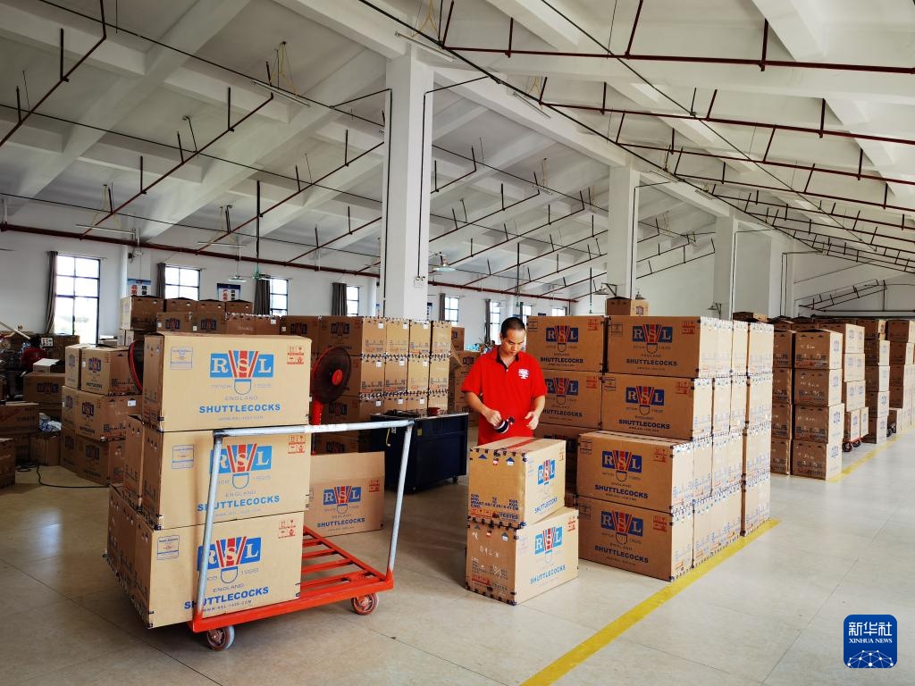 7月16日,在貴州亞獅龍體育文化產(chǎn)業(yè)發(fā)展有限公司,員工準備運輸羽毛球成品(手機照片)。新華社記者 向定杰 攝