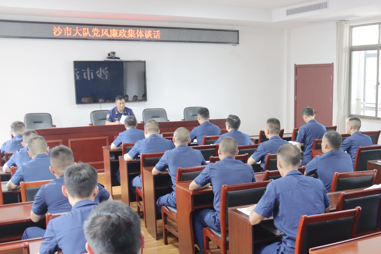 (圖說:荊州市沙市區消防救援大隊大隊長劉文函對全體消防救援人員進行黨風廉政集體談話 彭翔宇/攝)
