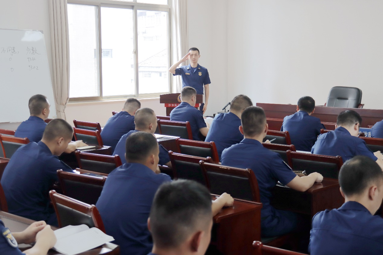 (圖說:荊州市沙市區消防救援大隊副大隊長陳剛為全體消防救援人員上黨風廉政專題黨課 彭翔宇/攝)