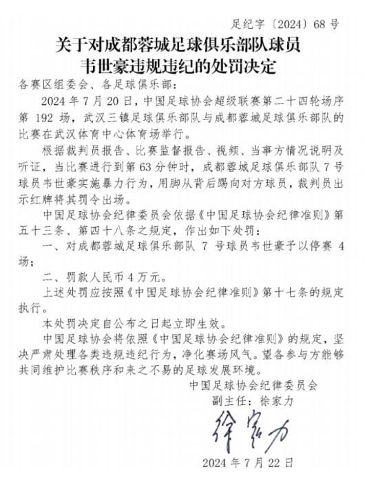 一、對(duì)成都蓉城足球俱樂部隊(duì)7號(hào)球員韋世豪予以停賽4場(chǎng);