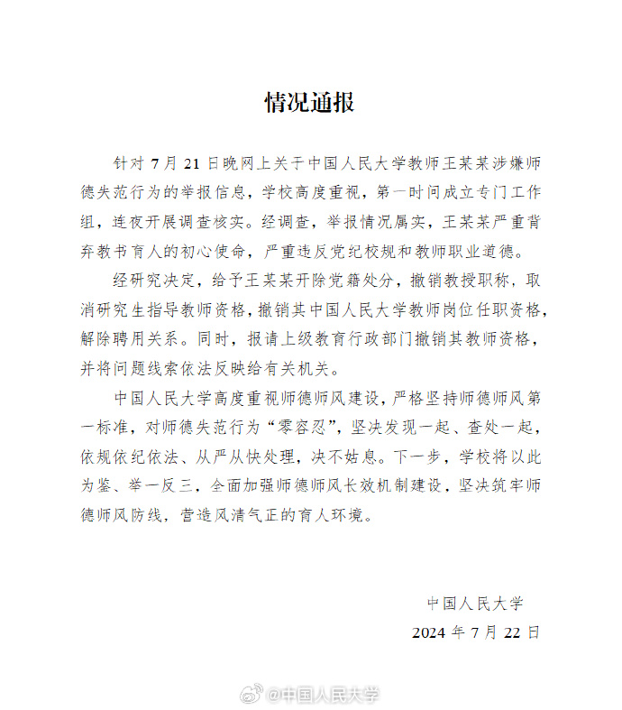 7月21日,中國人民大學一名在讀博士生在網上發視頻舉報其導師對其性騷擾。中國人民大學22日早上8:40發布通報稱,學校關注到舉報信息后,第一時間成立工作組,連夜開展調查核實。22日晚上7時許,該校再發通報稱,經調查,舉報情況屬實,決定撤銷王某某中國人民大學教師崗位任職資格,解除聘用關系。
