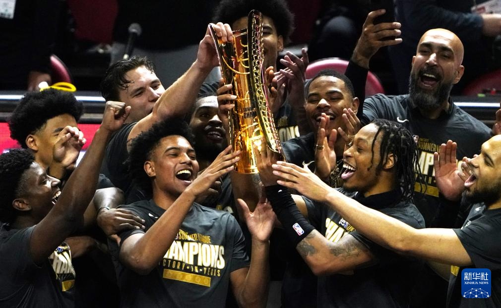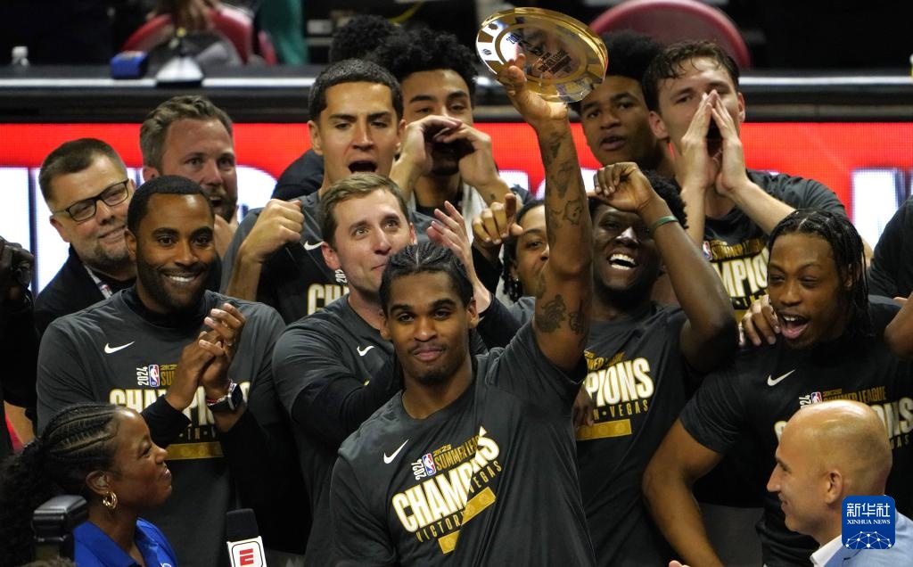 7月22日,熱火隊球員克里斯托弗舉(前中)在頒獎儀式上舉起夏季聯(lián)賽最有價值球員(MVP)獎杯。新華社記者 吳曉凌 攝