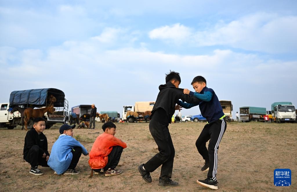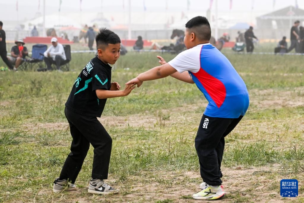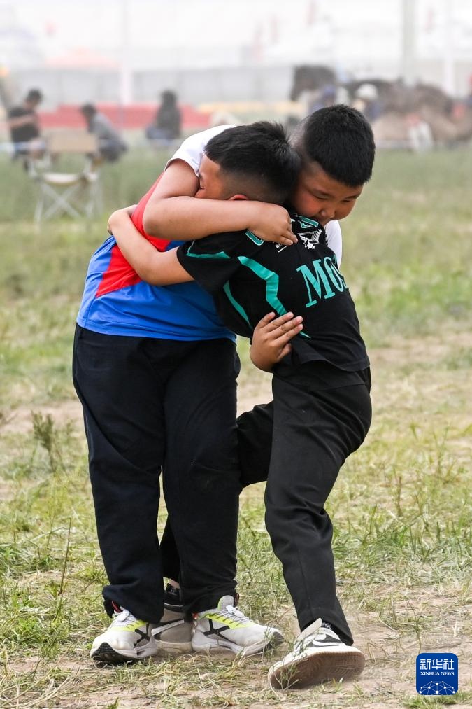 7月15日,兩名少年在位于那達(dá)慕賽馬比賽集結(jié)點(diǎn)摔跤。新華社記者 貝赫 攝