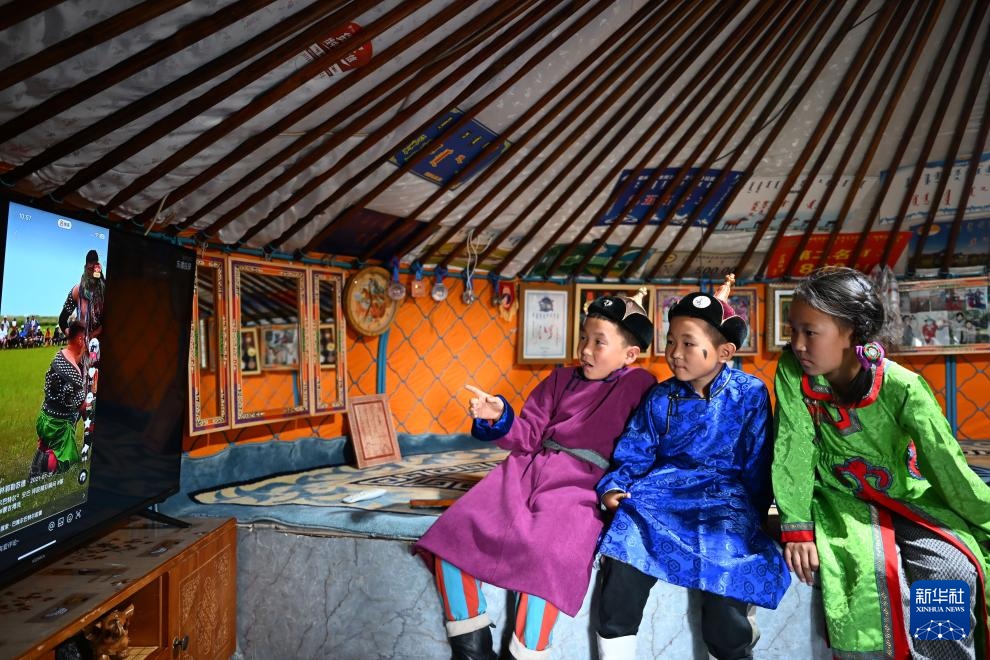 7月12日,車(chē)?yán)漳矩暎ㄗ螅┰诩抑信c鄰居烏云(右)、表弟歐格穆?tīng)栍^看搏克視頻。新華社記者 貝赫 攝