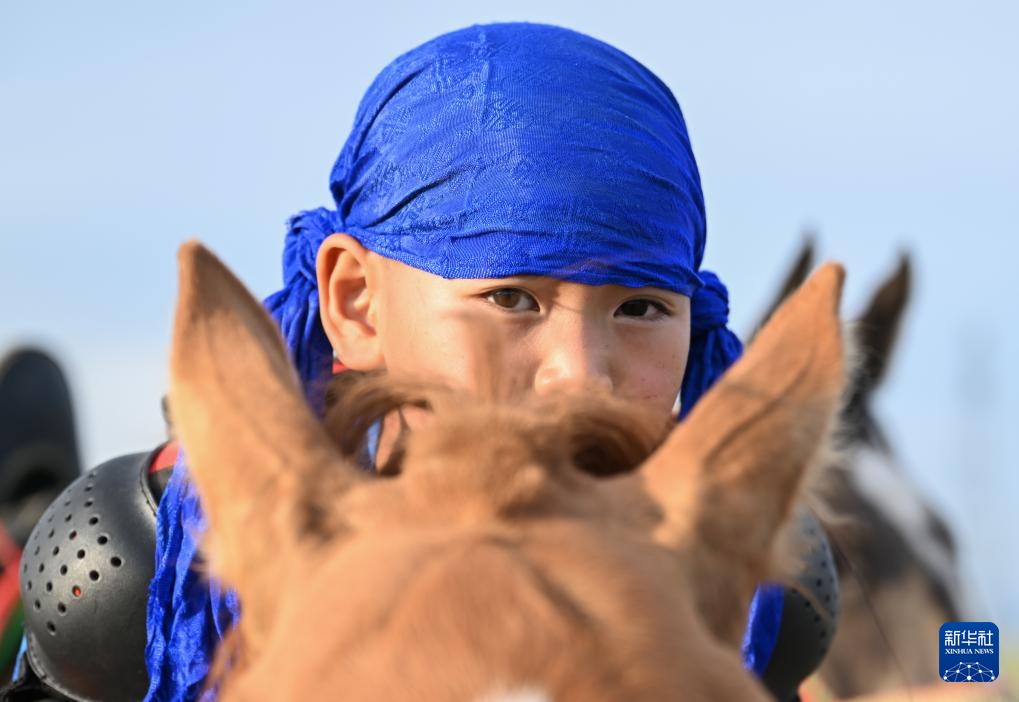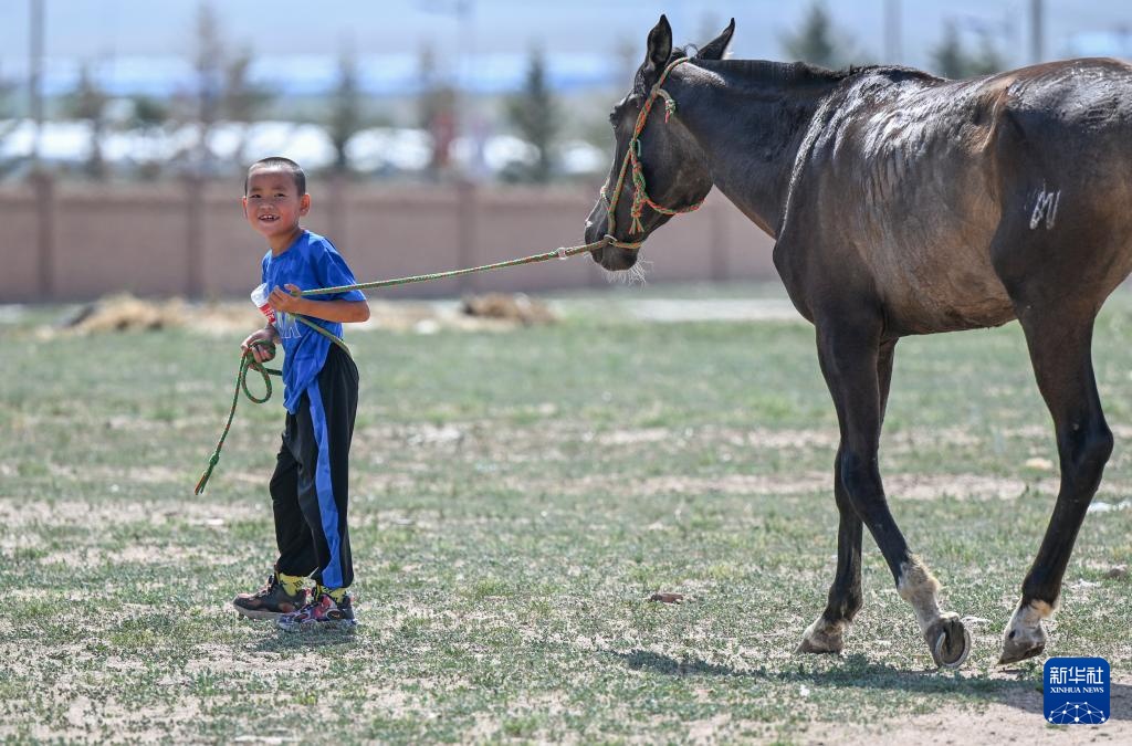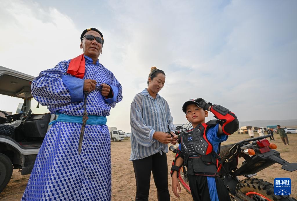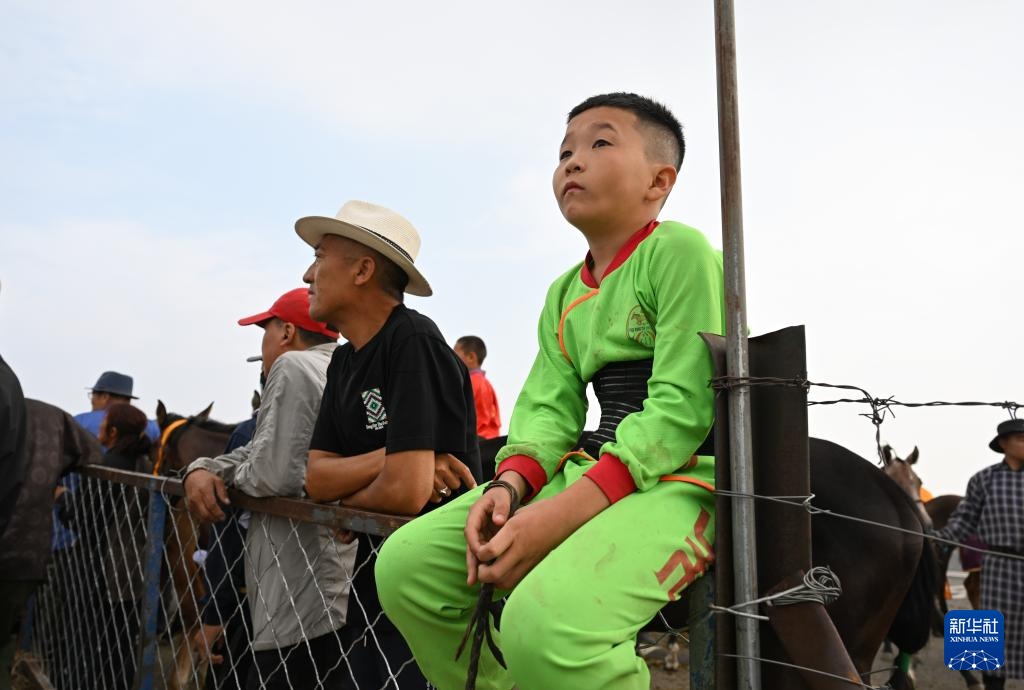 7月15日,阿吉太(右一)跟隨父母親來(lái)到那達(dá)慕賽馬場(chǎng),他參加了二歲馬八8公里和三歲馬12公里比賽。新華社記者 連振 攝
