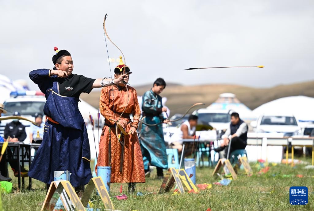 7月16日,額尼日勒(前左)在那達(dá)慕射箭比賽中。新華社記者 貝赫 攝