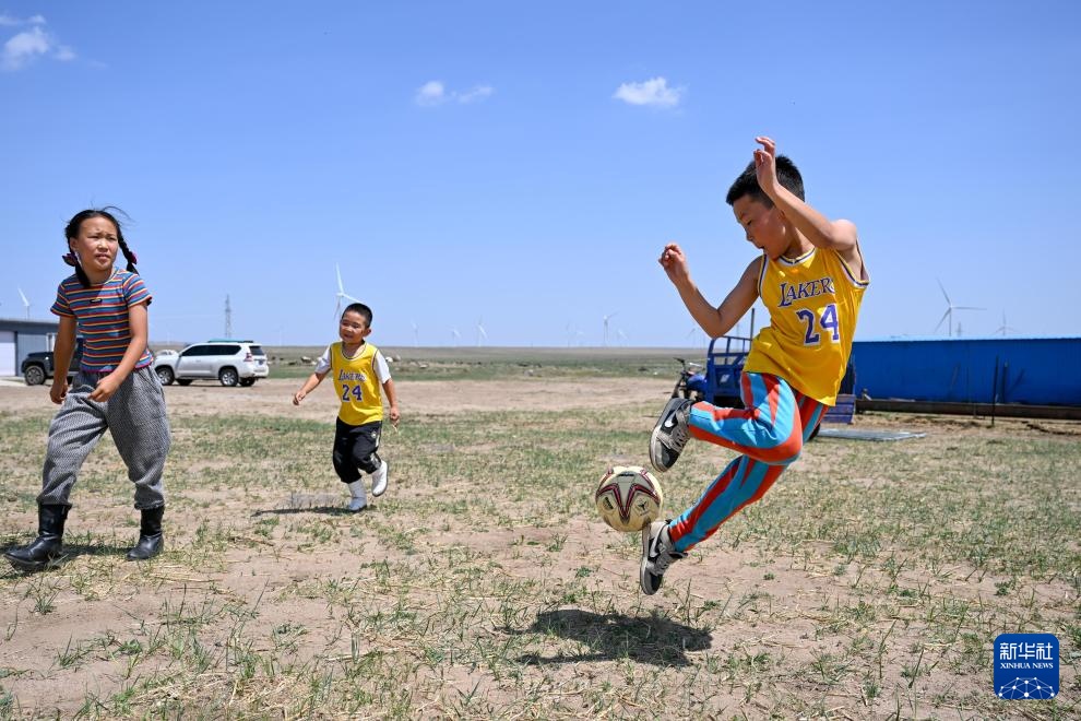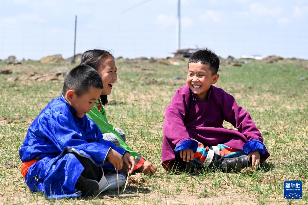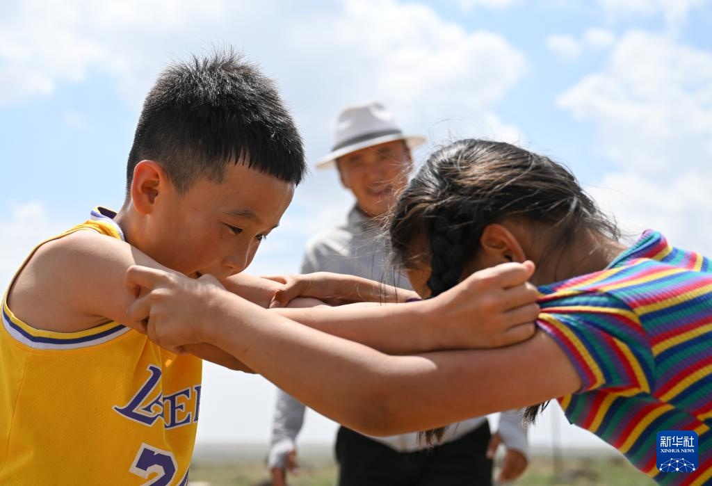 7月12日,車(chē)?yán)漳矩暎ㄗ螅┡c舅舅在草原上練習(xí)搏克。新華社記者 李志鵬 攝