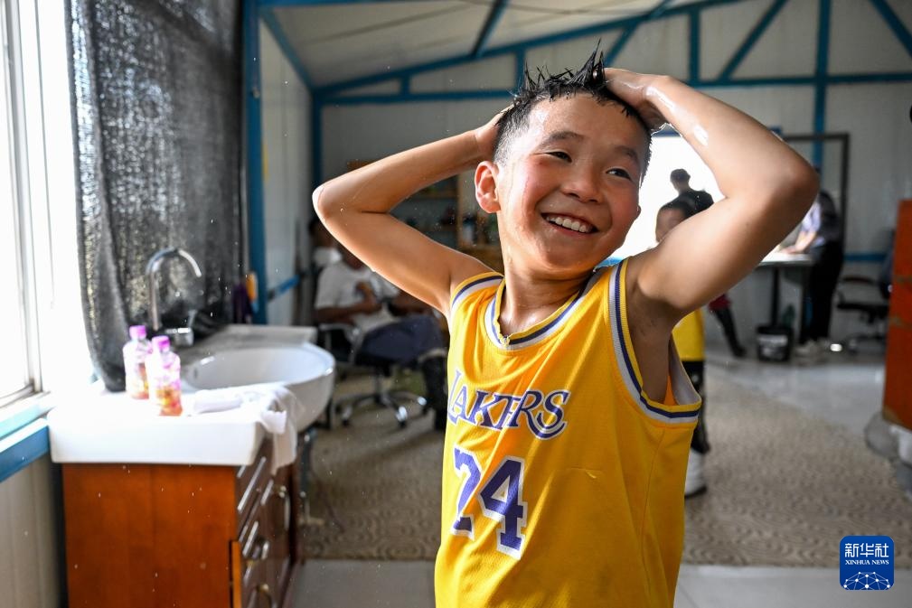 7月11日,父親哈斯敖其爾(右)為阿吉太整理頭巾。新華社記者 連振 攝