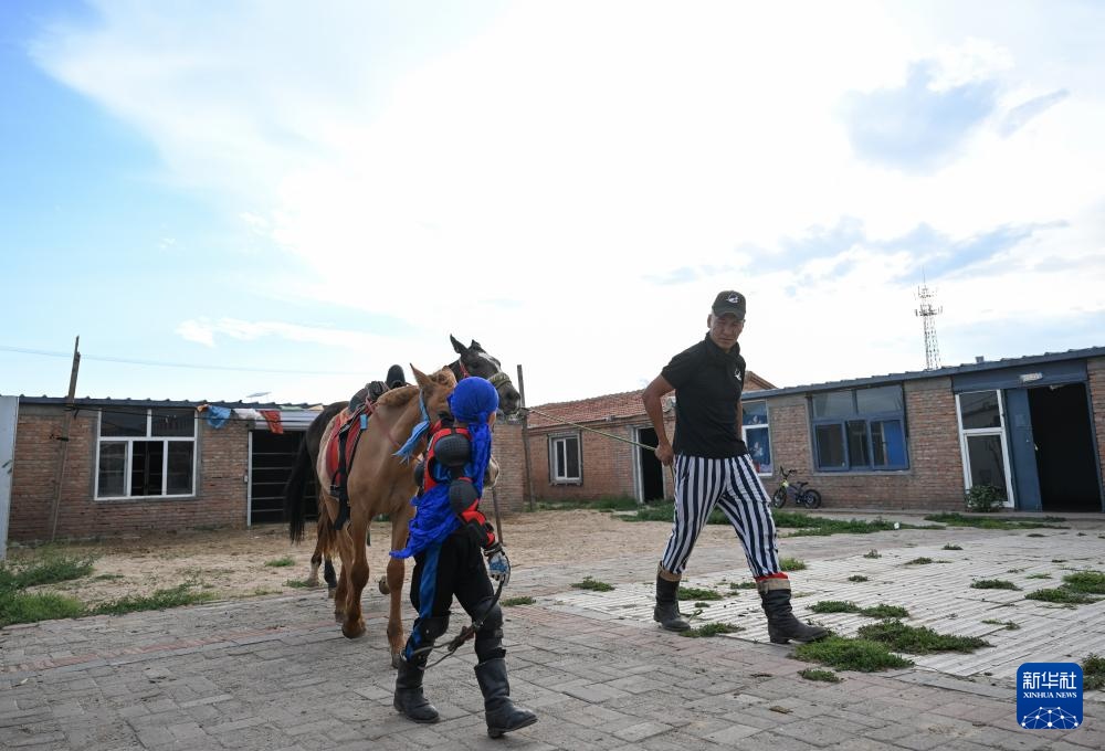 7月11日,阿吉太(左)和父親哈斯敖其爾牽著馬去草原上訓(xùn)練。新華社記者 貝赫 攝