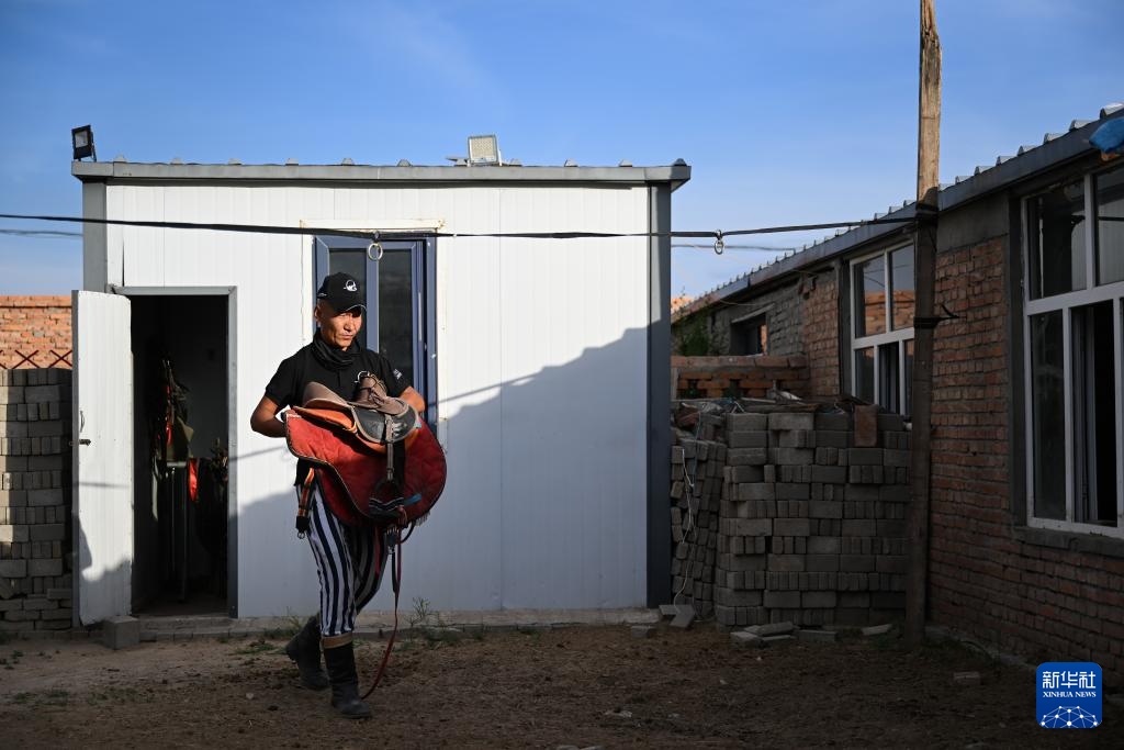 7月11日, 阿吉太將馬牽出,準(zhǔn)備去草原上訓(xùn)練。新華社記者 李志鵬 攝