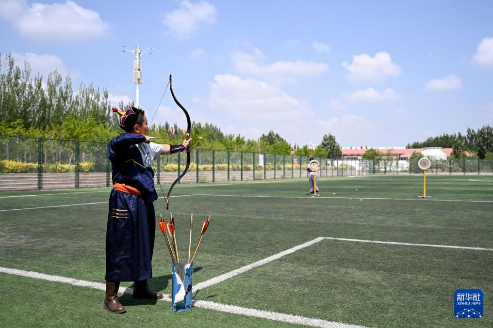 在那達(dá)慕的射箭賽場(chǎng)上,13歲的額尼日勒捏緊弓弦,緊盯箭靶。傳統(tǒng)射箭,蒙語(yǔ)稱(chēng)“哈日靶”,是牧民非常喜愛(ài)的體育運(yùn)動(dòng)。額尼日勒今年參加了內(nèi)蒙古哈日靶非遺傳承人圖雅的射箭興趣班,在興趣班上他勤加練習(xí),為那達(dá)慕上的比賽做好準(zhǔn)備。