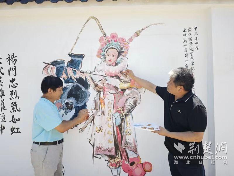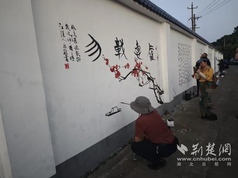 墻繪活動現(xiàn)場,藝術(shù)家們在楚陵文化墻上揮毫潑墨,將獨具荊楚文化特色的楚簡書法、代表中國文人風骨的梅竹書畫、體現(xiàn)中華民族精神的穆桂英、關(guān)公畫像、具有獨特魅力的中華詩詞、楹聯(lián)展現(xiàn)在楚陵文化墻上。參加現(xiàn)場書寫活動的藝術(shù)家們既有來自荊州市文聯(lián)、荊州市美術(shù)家協(xié)會、荊州畫院、荊州市志愿者協(xié)會、荊州市楚簡研究會、荊州區(qū)書法家協(xié)會、八嶺山鎮(zhèn)的地方代表,也有從武漢專程趕來的武漢理工大學、湖北美術(shù)學院、湖北第二師范學院、武漢商學院、湖北省幼兒師范高等專科學校的代表。