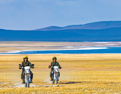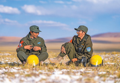 扎西羅布(右)和同事在巡護途中休息。 以上圖片均為本報記者徐馭堯攝 |