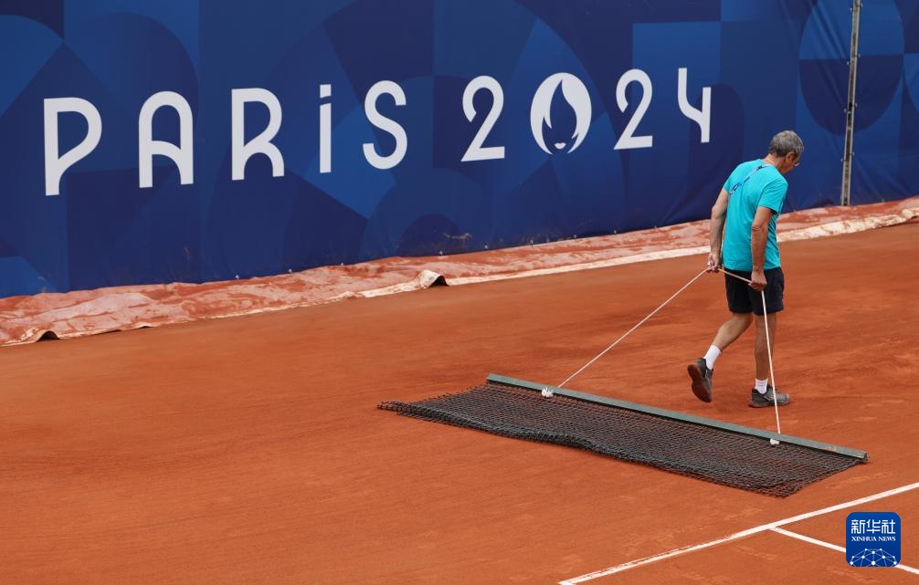 7月23日,在法國(guó)巴黎羅蘭·加洛斯體育場(chǎng),工作人員在整理紅土場(chǎng)。新華社記者 高靜 攝