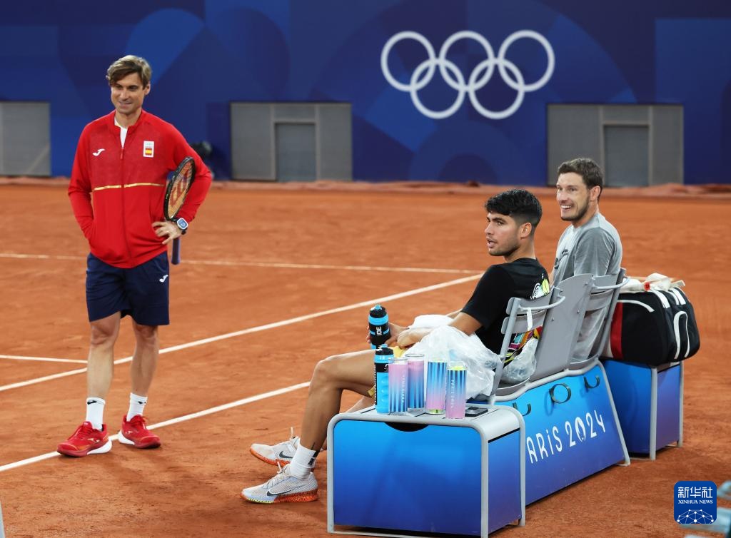 7月23日,在羅蘭·加洛斯體育場(chǎng)中央球場(chǎng)——菲利普·夏蒂埃球場(chǎng),西班牙名將阿爾卡拉斯(中)參加賽前訓(xùn)練。新華社記者 高靜 攝