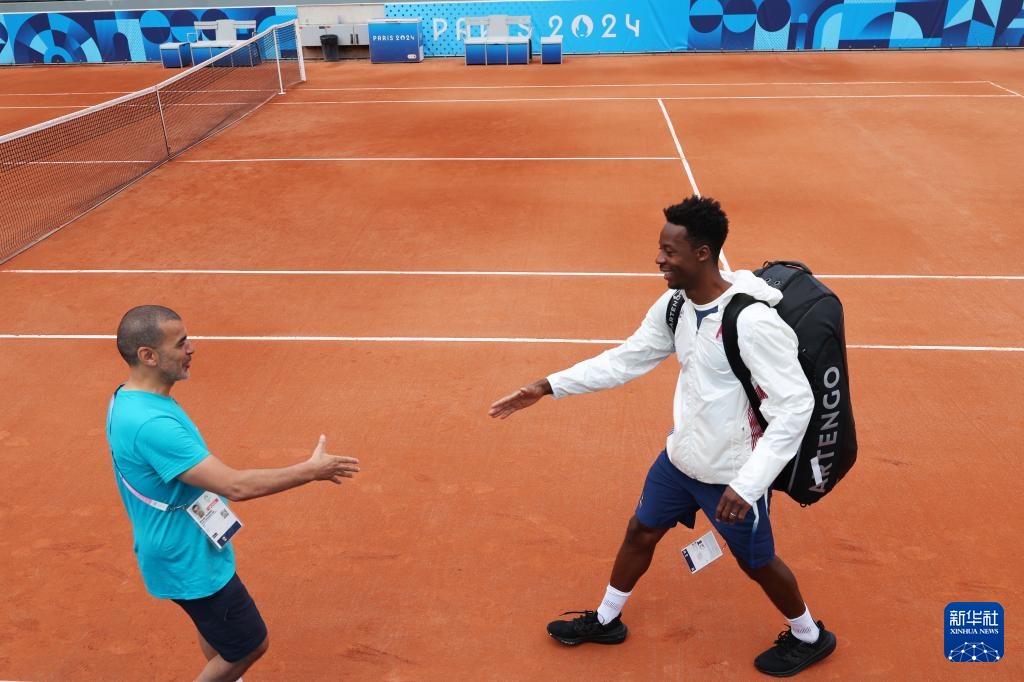 7月23日,在法國(guó)巴黎羅蘭·加洛斯體育場(chǎng),法國(guó)網(wǎng)球運(yùn)動(dòng)員孟菲斯(右)抵達(dá)球場(chǎng)訓(xùn)練。新華社記者 高靜 攝