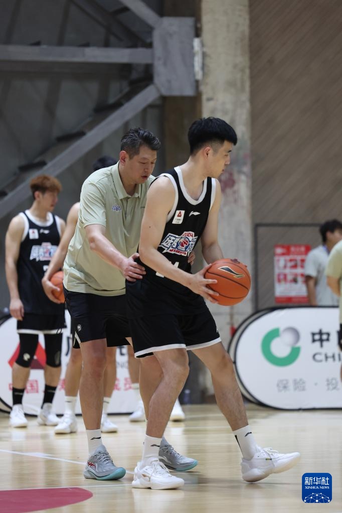 7月23日,教練員莫科(前)在開營儀式后為訓練營球員示范投籃。新華社記者 白雪飛 攝