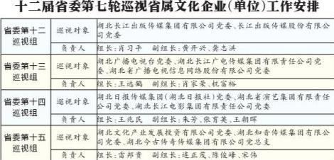 經省委批準,十二屆省委第七輪巡視將派出4個巡視組,對湖北長江出版傳媒集團有限公司等11家省屬文化企業(單位)黨組織開展巡視,同步開展選人用人、落實意識形態工作責任制專項檢查。