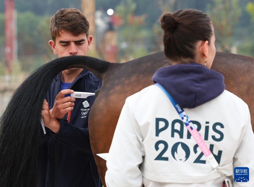 7月24日,英國隊(duì)工作人員對準(zhǔn)備進(jìn)入賽場馬廄的賽馬測量體溫。新華社記者 楊磊 攝
