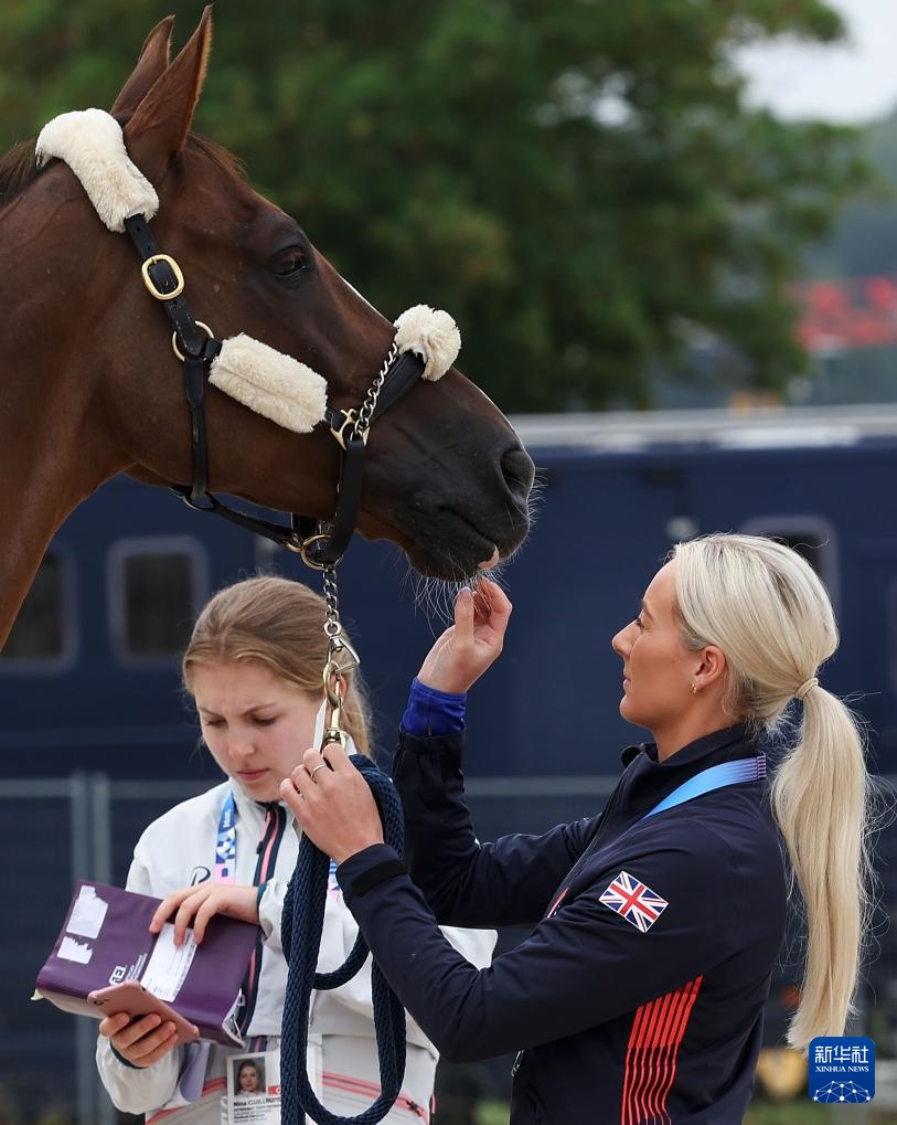 7月24日,英國隊(duì)工作人員在安撫準(zhǔn)備進(jìn)入賽場馬廄的賽馬。新華社記者 楊磊 攝