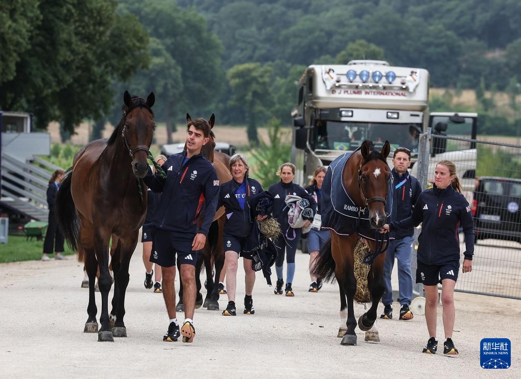 當(dāng)日,參加巴黎奧運(yùn)會馬術(shù)比賽的各隊(duì)賽馬陸續(xù)抵達(dá)位于巴黎凡爾賽宮的馬術(shù)賽場。