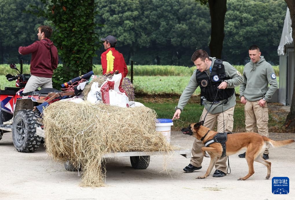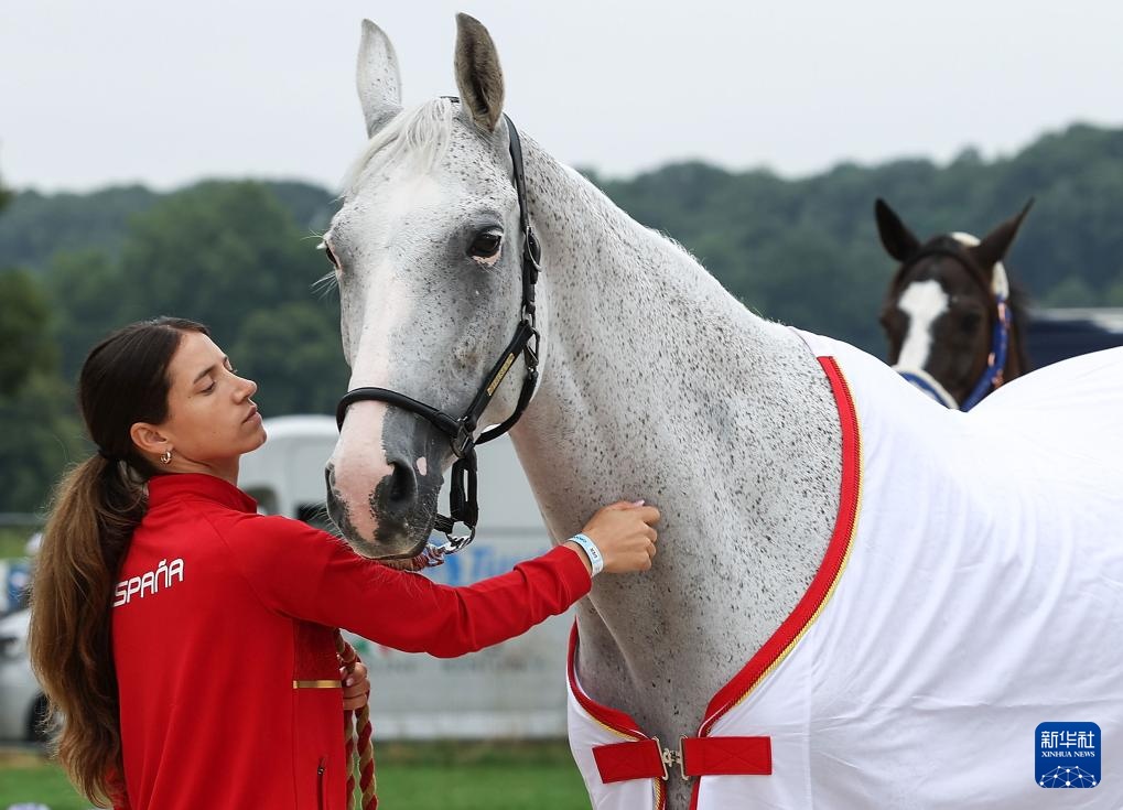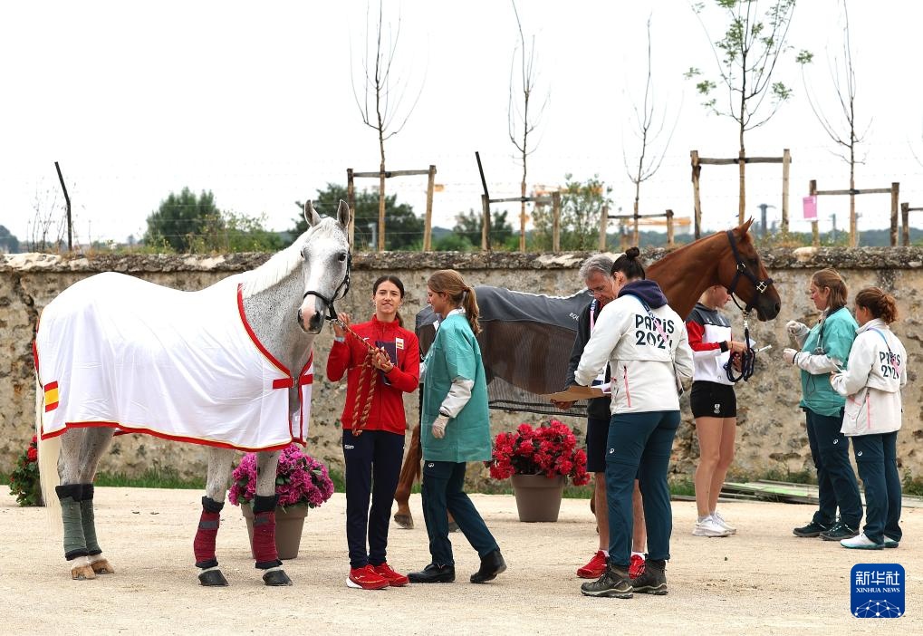 7月24日,工作人員對準(zhǔn)備進(jìn)入賽場的西班牙隊(duì)賽馬進(jìn)行健康檢查。新華社記者 楊磊 攝