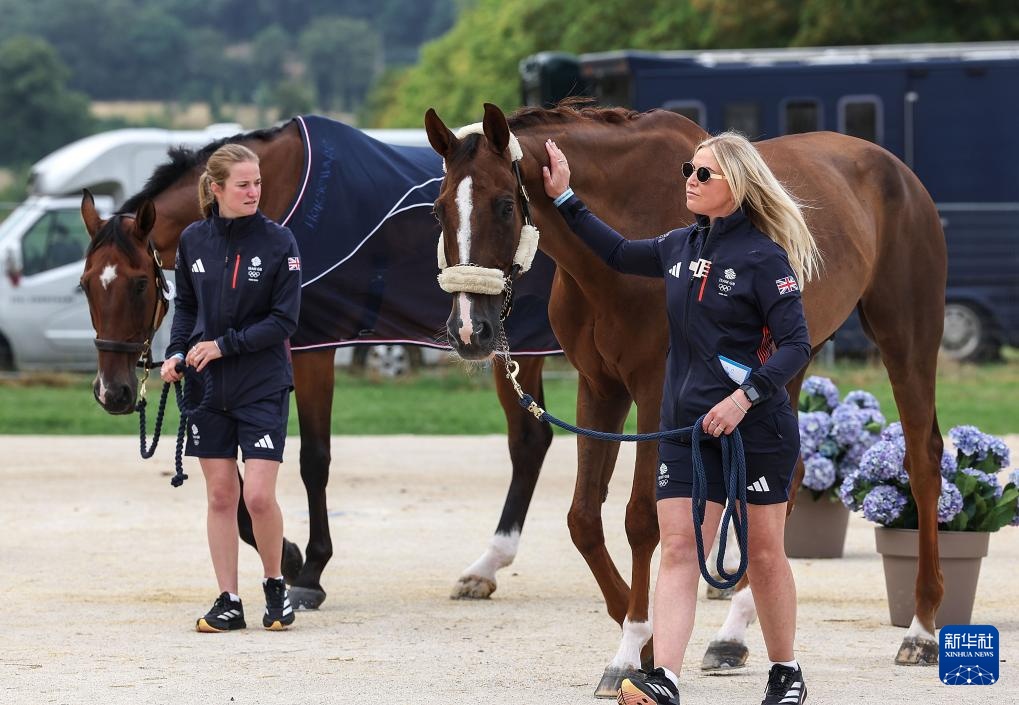 7月24日,英國隊(duì)工作人員牽引賽馬準(zhǔn)備進(jìn)入賽場馬廄。新華社記者 楊磊 攝