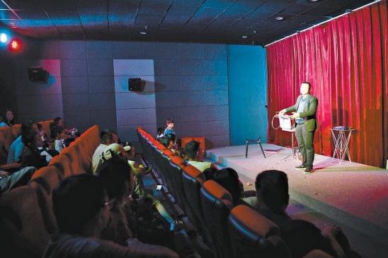 位于東四十條橋的東環影城,當下正在上演近景兒童魔術劇。北京市電影股份有限公司總經理助理段延廷說,他們借助上級單位北京演藝集團的演出資源,探索在影院里上演小型演出。“當時因為缺乏足夠有吸引力的影片,影院空置率高,我們就開始在旗下東申影城(貴友店)、東環影城、金寶影城的‘京演1號廳’引入相聲、魔術、兒童劇、脫口秀等小型演出?!北本┑男⌒脱莩鰣鏊揪途o俏,不少演出團體正愁沒地兒演出,影院又想通過演出吸引人氣,雙方正好一拍即合,實現雙贏。