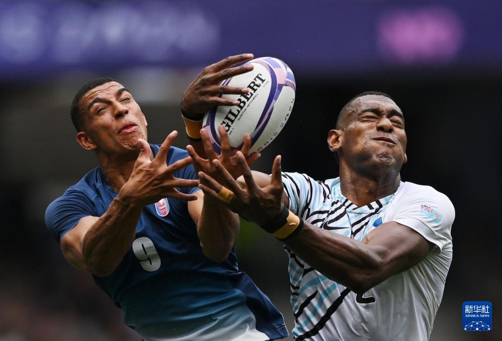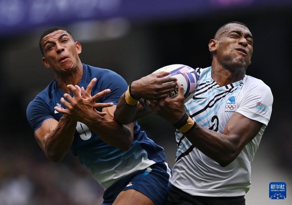 7月25日,斐濟隊球員喬瑟瓦(右)與法國隊球員阿龍拼搶。新華社記者 陶希夷 攝