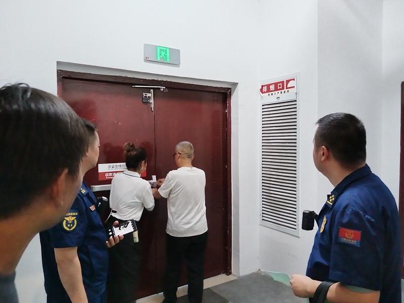 (圖說:消防監督員對疏散通道防火門進行檢查 余威/攝)