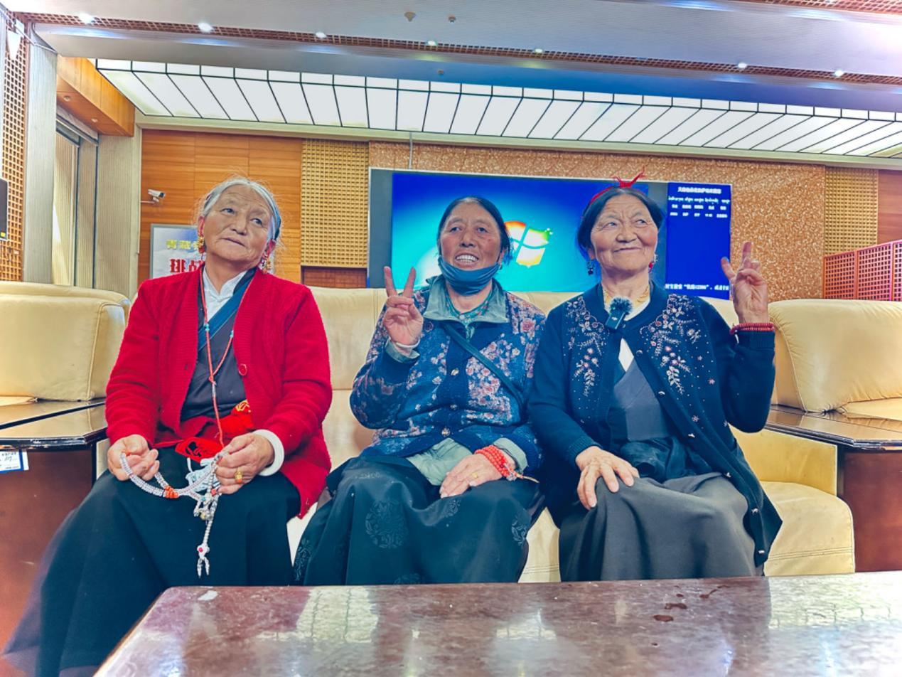 來自四川甘孜的三位阿媽在拉薩火車站等候前往青海西寧的列車。人民網記者 益西康珠攝