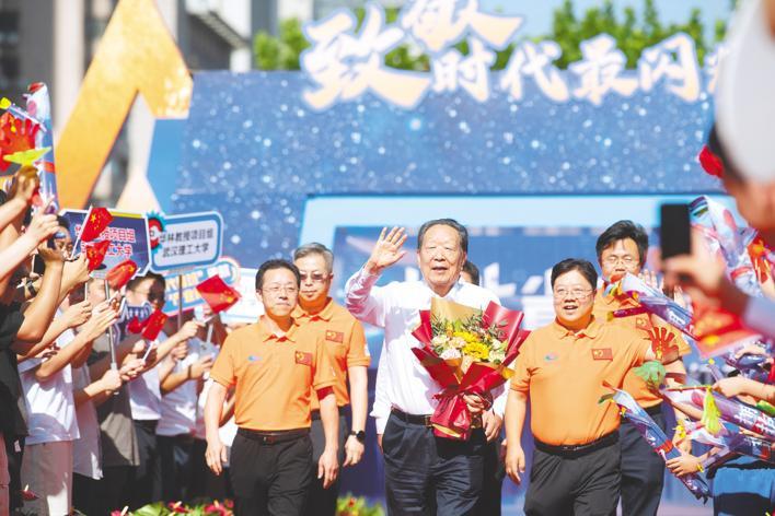 武漢大學教授、湖北省唯一一位獲得中國科學院院士、中國工程院院士雙院士殊榮的科學家——李德仁及團隊走上紅毯。 7月26日,湖北省科技大會在武漢洪山禮堂隆重舉行,14位院士專家在夾道歡呼聲中走過紅毯進入會場。 (湖北日報全媒記者 何宇欣 攝)