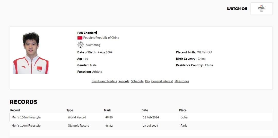 目前,巴黎奧運會選手資料卡已經更新:男子100米自由泳世界紀錄與奧運紀錄的保持者都是中國選手潘展樂。