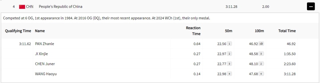 比賽中,第一棒出發的潘展樂出發反應時間出色,為0.64秒。此后,他很快占據領先身位。50米時,他以22秒56的成績排名第一,并以46秒92的成績觸壁完成交接。