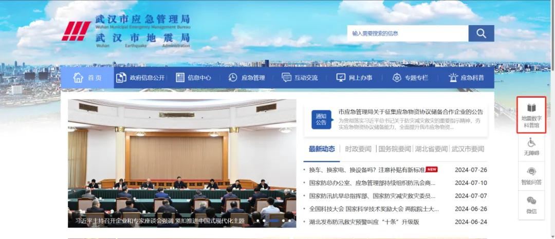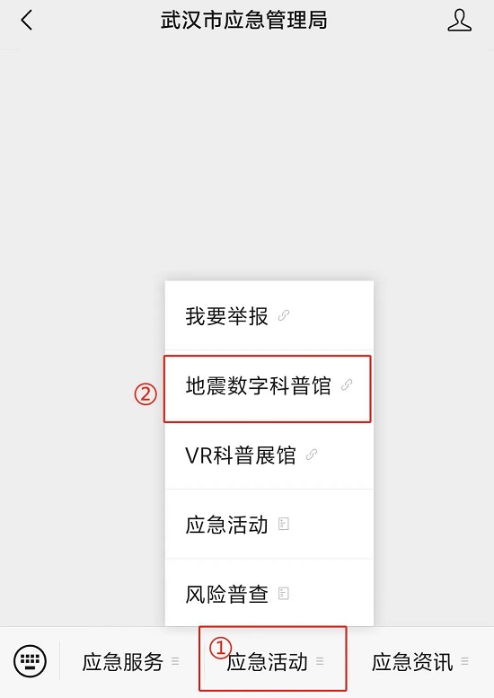 武漢市防震減災數字科普館的參觀方式有兩種,一是通過訪問武漢市應急管理局官方網站,點擊網站最右側“地震數字科普館”(https://yjj.wuhan.gov.cn/dzszkpg/)進入參觀頁面;二是關注“武漢市應急管理局”微信公眾號,點擊菜單欄“應急活動”—“地震數字科普館”進行參觀。