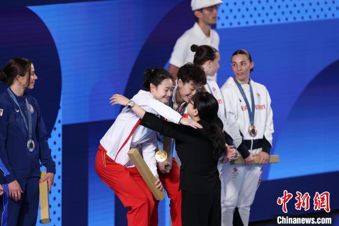 7月27日,在巴黎奧運會跳水女子雙人3米板決賽中,中國選手昌雅妮/陳藝文奪得金牌。頒獎典禮上,世界泳聯副主席周繼紅擁抱昌雅妮(左二)/陳藝文。中新社記者 富田 攝