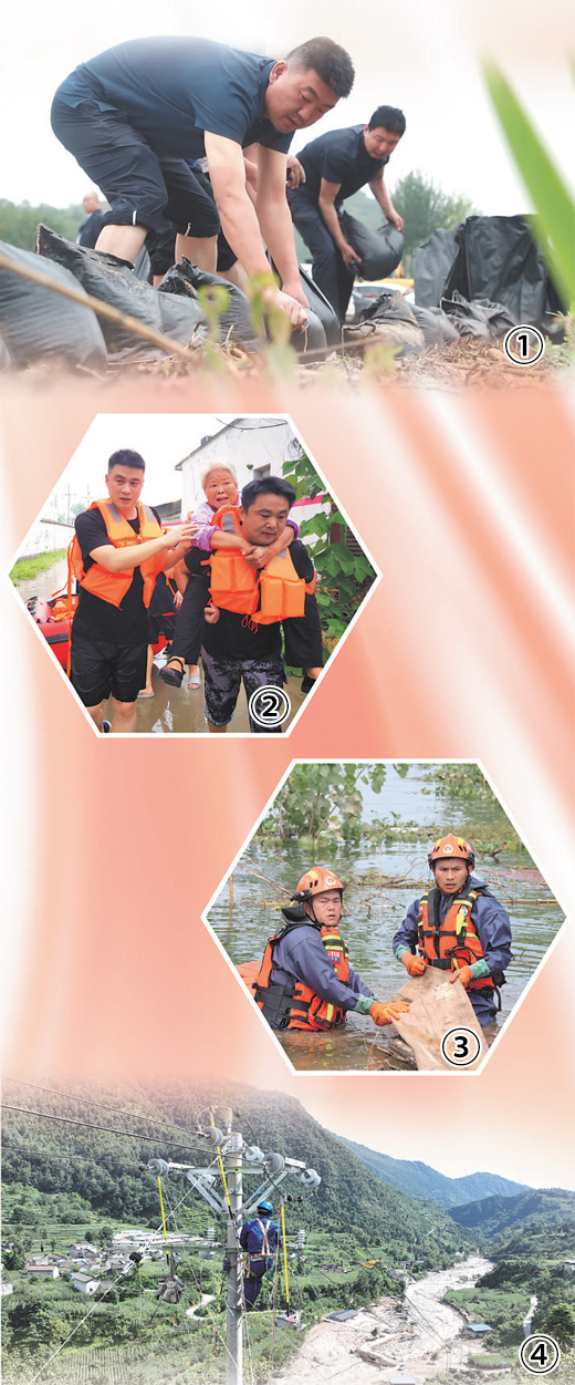 圖①:甘肅省成縣陳院鎮(zhèn)盧家溝村黨員干部填裝沙袋,封堵農(nóng)田被大水沖出的缺口。 蹇寶民攝 圖②:河南省社旗縣大馮營鎮(zhèn)黨員干部轉(zhuǎn)移受災群眾。 申鴻皓攝 圖③:湖南省永州市消防救援支隊黨員突擊隊隊員在團洲垸洞庭湖一線堤防進行排水作業(yè)。 石勛堅攝 圖④:四川省漢源縣馬烈鄉(xiāng),連心橋共產(chǎn)黨員服務隊隊員搶修電力設施。 本報記者 宋豪新攝 |