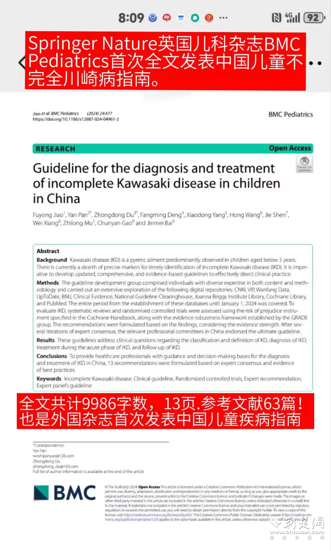 荊楚網(wǎng)(湖北日報網(wǎng))訊(通訊員杜川 鄭丹 張世琳)7月27日,全球知名的學術出版商 Springer Nature 旗下的英國兒科雜志 BMC Pediatrics首次全文發(fā)表了《中國兒童不完全性川崎病診療指南》,荊州市第一人民醫(yī)院兒科副主任醫(yī)師潘炎作為共同通訊作者參與指南撰寫。