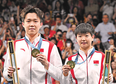 當地時間7月30日,王楚欽(左)/孫穎莎在頒獎儀式上。 本報記者 雷 聲攝 |