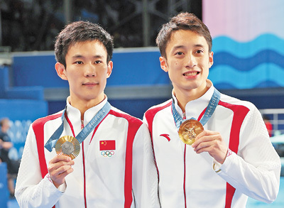 當地時間7月29日,練俊杰(右)/楊昊在展示金牌。 本報記者 厲衍飛攝 |